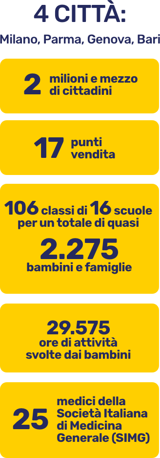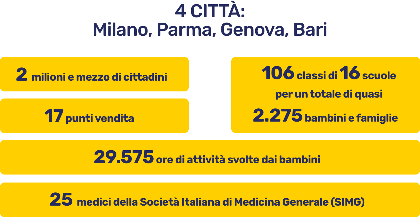 Nelle scuole i bambini hanno partecipato a un percorso ludico-educativo in 7 tappe tematiche, “dal corpo alla spesa”, in cui hanno imparato, divertendosi, l’importanza delle proprie abitudini alimentari e del movimento quotidiano. Ogni classe partecipante è stata coinvolta in incontri “laboratorio” con animatori e ha ricevuto un kit ricco di materiali e strumenti di supporto alle attività, fra cui una guida per gli insegnanti utile ad impostare le attività didattiche e ad approfondirle. Nella tappa finale del percorso i bambini hanno fatto la spesa in un punto vendita della loro città, motivando le loro scelte e dimostrando alle famiglie le conoscenze acquisite.