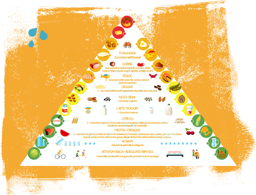Protagonista esemplare del percorso è la Piramide alimentare transculturale, elaborata dalla Società Italiana di Pediatria (SIP) con l’obiettivo di divulgare i sani principi della Dieta mediterranea, facendoli incontrare con gli alimenti di altre culture e popolazioni che vivono nel nostro Paese.